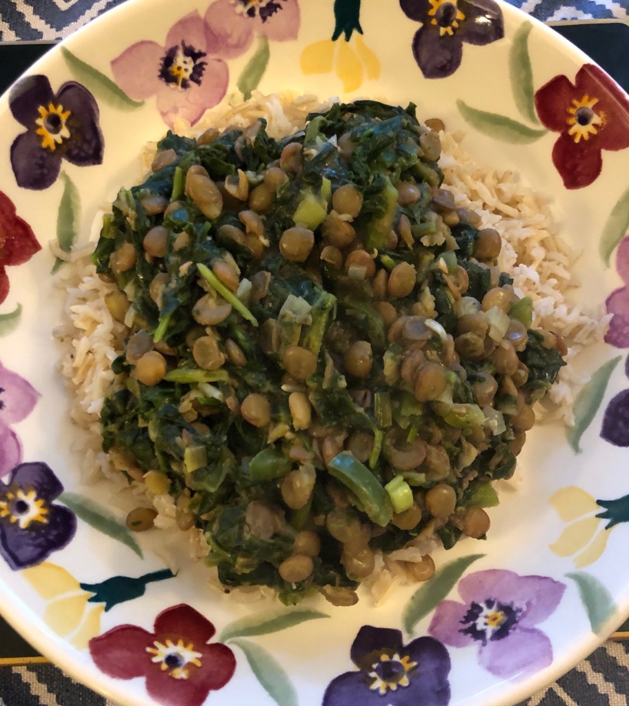 Add the spinach and coriander; stir and cook until the spinach has wilted. Now put in the drained lentils, salt and pepper. Stir to mix and bring to a simmer. Cover and cook gently for 20 minutes. Meanwhile, cook some rice. Add the lemon juice at the very end – the spinach will turn brown if you cook it with lemon for too long.