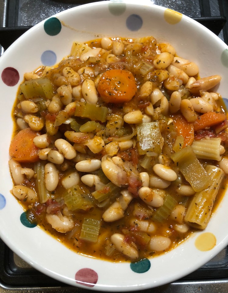 Take the plunge and dip into your stockpile with this cheap, nutritious combination of store-cupboard ingredients. It requires some forethought (soaking the beans overnight) but you could use tinned ones if you forget. Serve with bread or turn into a complete one-pot meal by adding 2 large handfuls of pasta 20 minutes before the end of the cooking time. For non-vegetarians, the addition of chopped chorizo, again towards the end, adds another layer of flavour and texture. One important tip: when you are cooking dried beans, make sure you use an unsalted cooking liquid. The husk of the bean will not soften if cooked in salt.