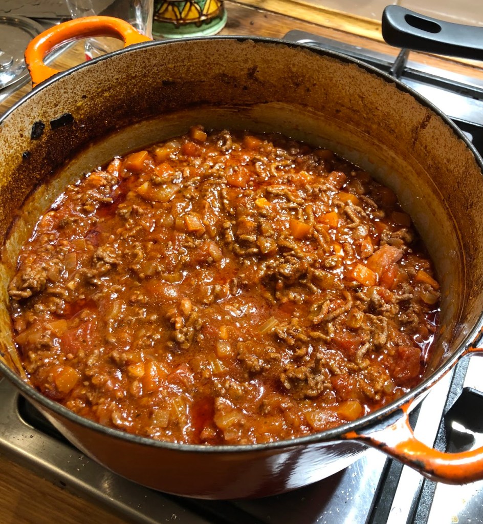 As Felicity Cloake has written (in her excellent series ‘How to make a perfect…’): “To write on spag bol is to wade into a mire of controversy thicker and darker than any ragu that ever came out of nonna’s kitchen.” There is no definitive recipe for bolognese sauce and many of the ‘authentic’ elements (pork, chicken liver, white wine, milk or cream, not too much tomato) do not feature in our family’s version. I am making absolutely no claims about authenticity here, just recording what we like to eat.