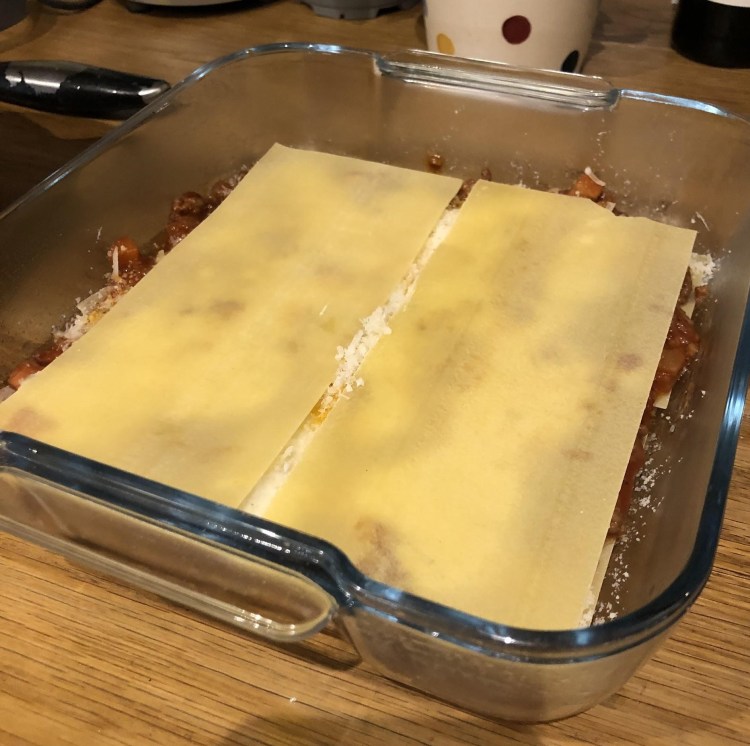 Set up your station for assembling the lasagne: bolognese sauce, béchamel sauce, parmesan, lasagne. My preferred order of assembly is: 3 tbsp bolognese, a drizzle of béchamel, 3 tbsp parmesan, 2 sheets lasagne. Do this four times, then finish with a thicker layer of bolognese, the rest of the béchamel and a really thick carpet of grated parmesan.