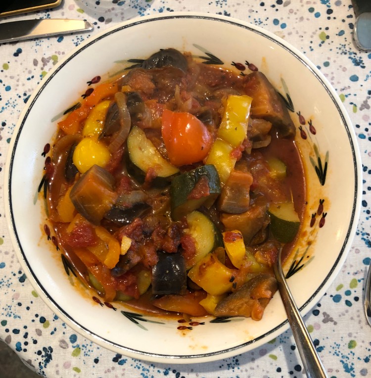 Heat the olive oil in a heavy lidded saucepan over a medium heat. Add the onion and garlic, lower the heat and cook to soften for five minutes. Add the aubergine (no need to salt in advance – aubergines are rarely bitter these days) and the peppers, stir and cook gently for another 5 minutes. Add the chopped tomatoes, bay leaf, dried herbs, salt and pepper. Bring to a simmer, cover the pan and cook for 10 minutes, then add the courgettes and cook for a further 10 minutes. The timings here are very approximate, but the point is that courgettes take less time to cook than aubergines and peppers. If you have fresh herbs, add these towards the end instead of boiling the life out of them. Serve warm or at room temperature.