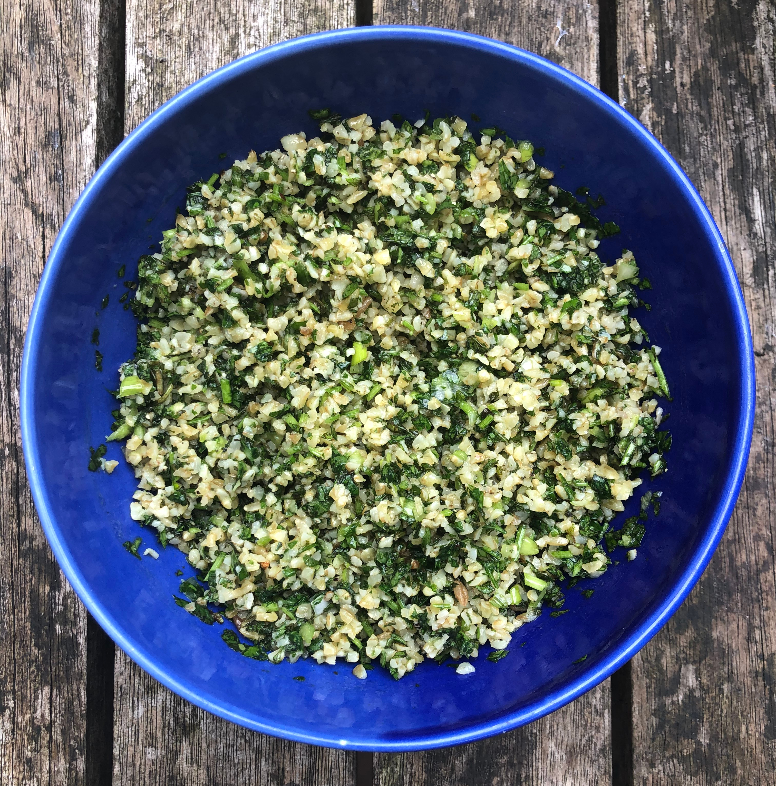 Finely chop the herbs and the spring onions (I use a food processor for this), then stir into the bulgur wheat, along with the olive oil, salt and pepper. Add the lemon juice just before serving. Check seasoning and add more salt and / or lemon juice to taste.
