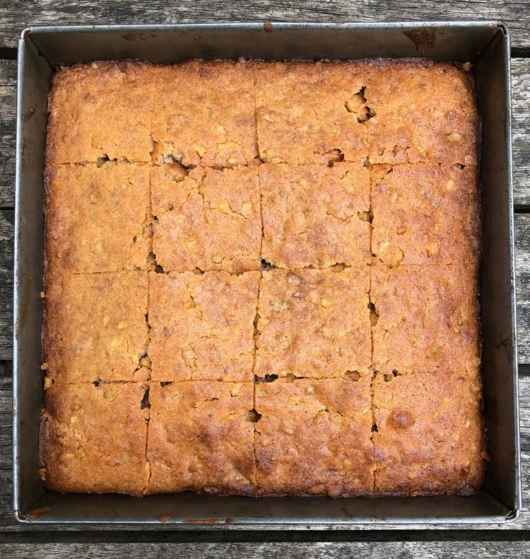 Whisk the egg whites with a pinch of salt until stiff and fold them in, with a metal spoon, alternating them with the sifted flour, until they have both been incorporated into the mixture. Spread it evenly in the greased baking tin. The mixture should be about 4cm thick, once spread. Bake for 35 minutes, until nicely risen and golden-topped. Remove from the oven but leave in the dish while you cut it in squares (approx 5 cm – my tin divides up neatly into 16 pieces).