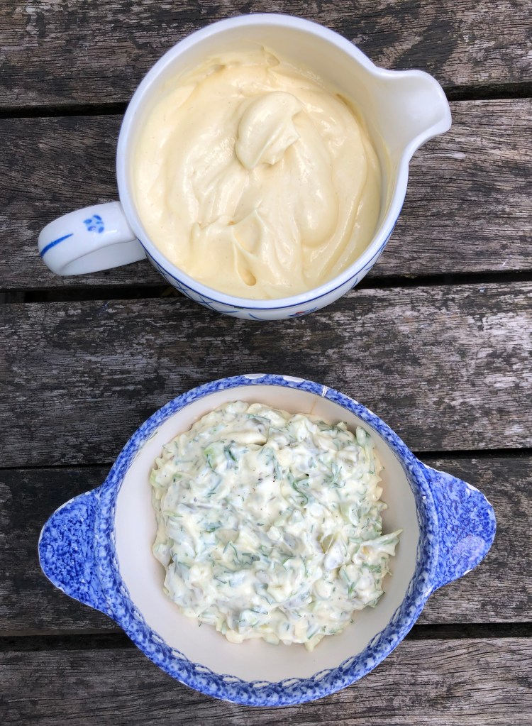 When made freshly, with good mayonnaise (shop-bought is absolutely fine) this is a fabulous sauce. Mix all the ingredients below together, taste and adjust seasoning. It’s pretty much identical to what we stir into boiled, cooled new potatoes to make a classic potato salad.