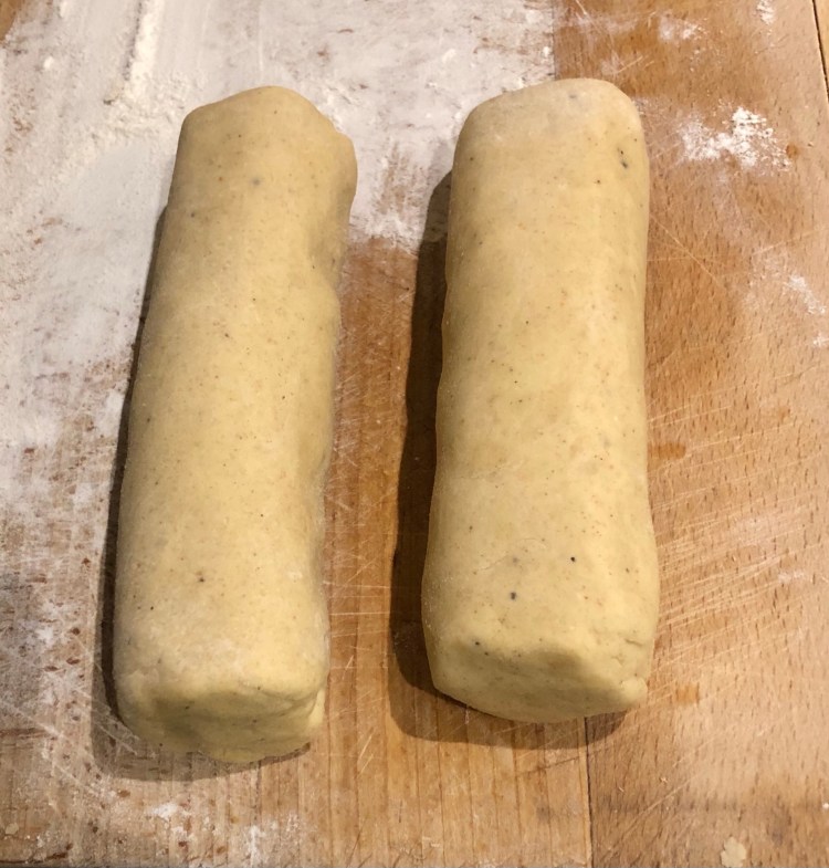 Add the dry ingredients and continue mixing until a soft dough is formed. Put the dough on a well-floured work surface and divide it in half. Using plenty of flour, both on your hands and on the work surface, roll each piece into a long log, 3- 4cm in diameter. Wrap each log in cling film and place in the fridge for about 30 minutes to firm up.