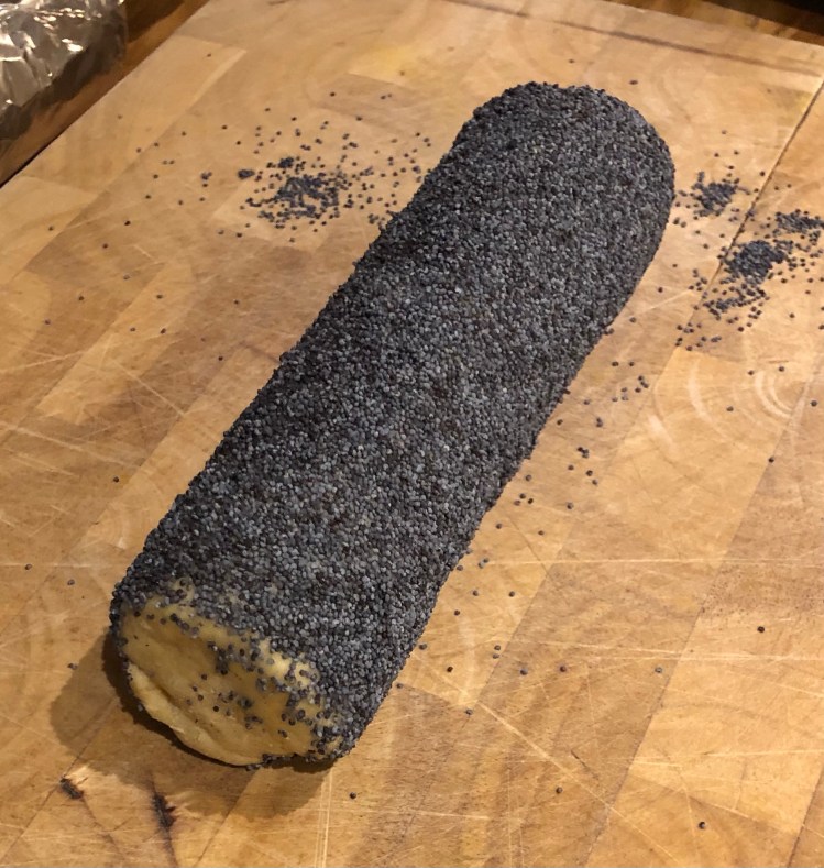 Scatter the poppyseeds over two sheets of foil large enough to wrap each log. Brush the logs with the beaten egg and then roll them in the poppyseeds until covered. Roll up the foil and secure the ends.