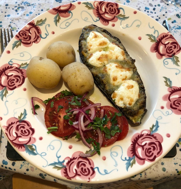 2 medium-sized aubergines (long rather than fat), halved lengthways